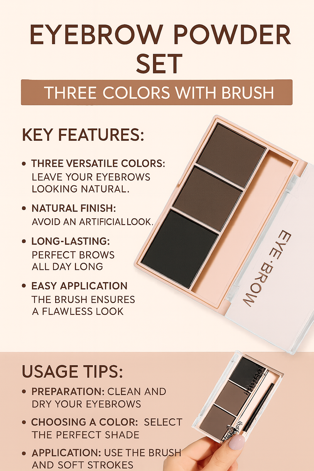 Three-color eyebrow powder shadow with a natural, three-dimensional finish.